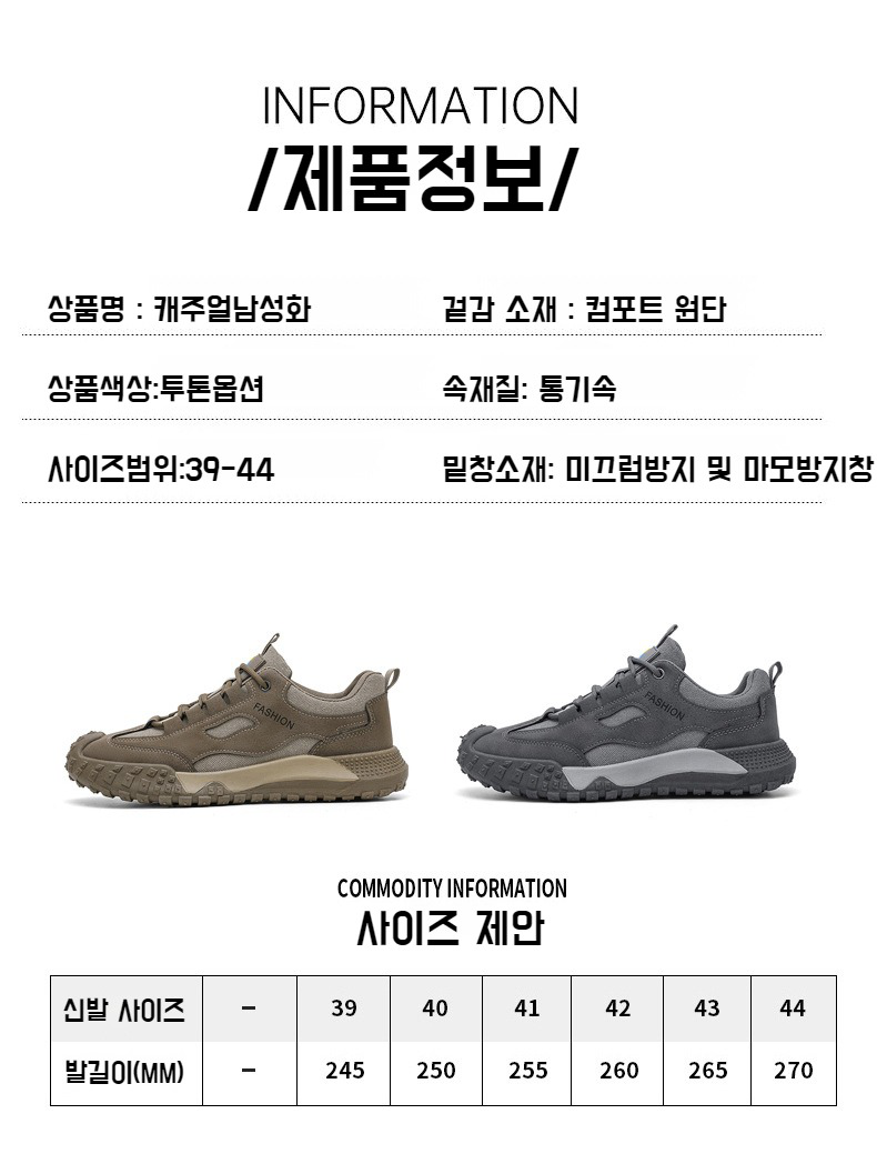 ● 사계절 내내 착용 가능한 남성 캐주얼화로 내마모성이 뛰어나 장시간 사용에도 형태와 품질이 유지됩니다. ● 미끄럼 방지 아웃솔과 통굽 디자인으로 작업장이나 야외 활동 시에도 안정적이고 편안한 착화감을 제공합니다. ● 우수한 통기성과 방취 기능으로 하루 종일 신어도 쾌적함을 유지하며 발 냄새 걱정 없이 사용할 수 있습니다. ● 견고한 내구성과 트렌디한 디자인을 동시에 갖춰 일상생활은 물론 공사장 등 다양한 환경에서 활용도가 높습니다. ● 가볍고 편안한 착화감으로 장시간 활동에도 발에 부담이 적어 남성분들의 데일리 슈즈로 적극 추천합니다.